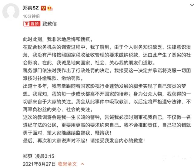 其实之前郑爽因为税务风波被罚款2.99亿元。张恒及相关企业涉嫌策划、帮助郑爽偷逃税款,也将依法受到处理。随后郑爽在个人微博中发布《道歉信》,称:“此时此刻,我非常地后悔和愧疚。”并表示:“我接受这一决定并承诺将克服一切困难按时补缴税款、缴纳罚款。”