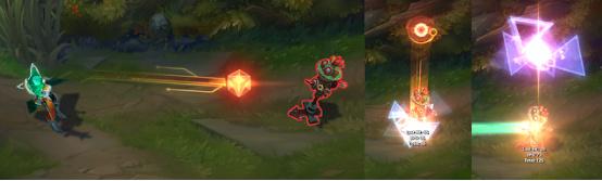Q技能特效,绿色的“钻石”甩出去命中目标后迎接是绿色外圈的黄色内核状,辨识度较高。