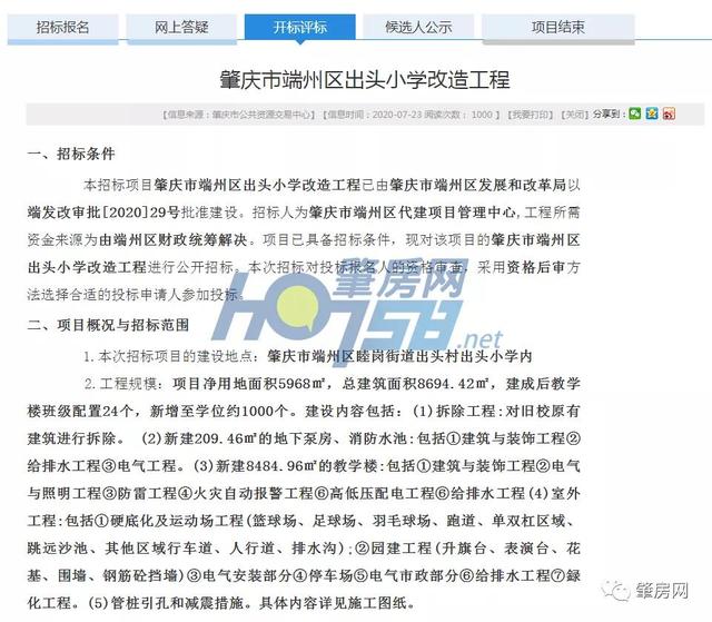 2020年7月23日,出头小学公开招标改造工程,项目净用地面积5968㎡,总建筑面积8694.42㎡,建成后教学楼后班级配置24个,新增至学位约1000个。