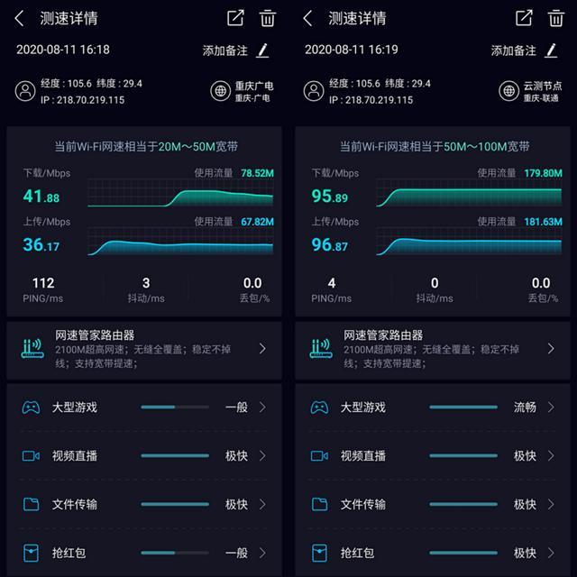 也就是说,1000M的宽带,有线网速不能低于900Mbps,WiFi网速不能低于800Mbps。5G网速与5G信号强弱、入网设备有关,波动幅度较大,但与4G网络相比,网速也有很大提升。