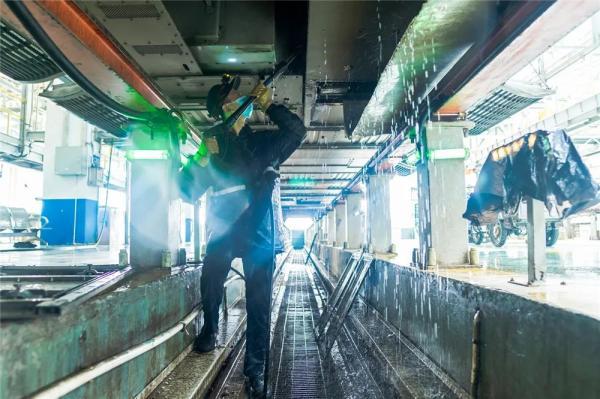 14时30分,无电检查结束后,杨文魁和他的同事穿着雨衣、防水胶鞋,戴好安全帽,开始处理空调高压故障。他们相互配合将动车组底板和裙板拆开,通过手电筒对滤网、蒸发器和冷凝器进行检查,随后使用高压水枪对冷凝器散热片进行冲洗。