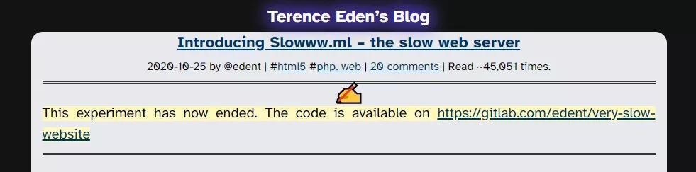 这网站名为 Slowww ( 网址:slowww.ml ),听名字就知道,这是一个和快完全不沾边的网站。它的开发者是一位名叫 Terence Eden 的英国程序员。