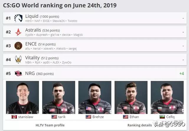 NRG是一支北美队伍,他们在引入保加利亚狙击手小胖CeRq,加拿大指挥daps等人后实力飙升,一举拿下了多个世界大赛预选赛的第一名,也就是当初被我们称之为的“线上王者”。而令中国玩家真正认识到这支队伍是在2018年IEM上海站,他们在决赛击败了TYLOO取得冠军。今年他们在多个世界大赛闯入4强,而且最近他们已经攀升至第5名。