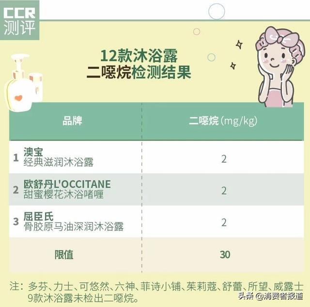 此次的检测结果显示,欧舒丹、屈臣氏、澳宝3款沐浴露检出二噁烷,含量为2mg/kg,符合我国标准以及欧盟SCCS的要求及建议,正常使用应当无碍。