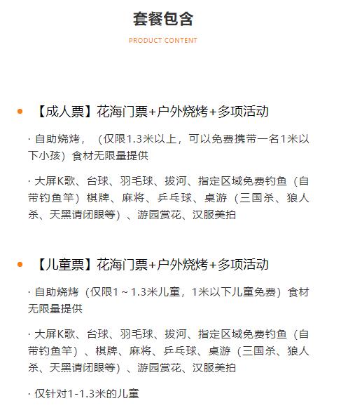 郊游野餐可不能随便,户外BBQ是一众好吃嘴的选择,坐落于花海景区内的户外烧烤区,准备好了各种新鲜素菜、诱人荤菜的菜品规格,不限量供应,还有BBQ需要的各种用具一应俱全!
