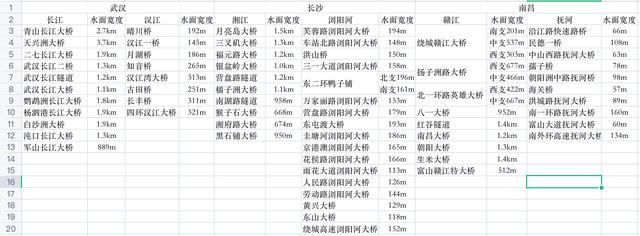 因为三城内水系发达,城市依江而建,所以城内的过江过河通道就是保障城市运行稳定的重要通道。总体来说,武汉因其城市规模大于长沙和南昌,在长江上的通道相对更多。考虑到河流的丰、枯水期造成河道宽度以及桥梁结构造成的引桥、主桥差异,所以在具体测量上均以百度地图河道标示宽度为准。数据采集只针对已经三城内重要建成投运的桥梁、隧道等(在“水面宽度”计算上河道内沙洲宽度全计,半岛只计河道真实宽度)。因为建设周期等因素可能存在不完整的情况,请网友们补充。
