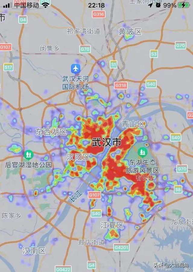 从上面的三城同时段热力图来看,武汉和长沙的高密度区域大小差异不大,但蓝色低密度区域范围明显大于长沙。考虑到武汉规划的六环线等快速环城通道,长沙的城市核心区域并不比武汉差太多,但城市框架现状和规划都还是大幅落后于武汉的。而南昌的热力图也能看出在红色高密度和蓝色低密度上均明显小于武汉、长沙,加之南昌周边缺乏中型地级市的支撑,短期内南昌市甚至没有更大的环线、绕城规划,这基本可以肯定目前南昌绕城高速已经是城市中期发展大框架范围,城市人口和建设规模确实在三城中最小。