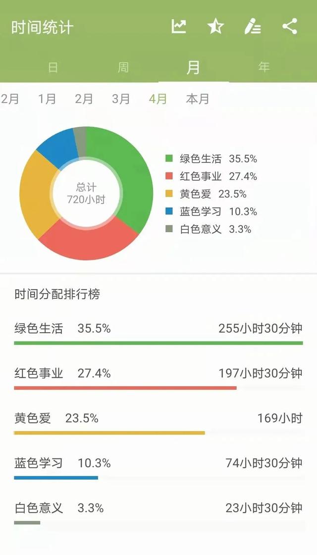除了手工记录之外,我还会用时间统计工具来做线上记录。4月依然充实并美好,4月有30天,合计是720小时,具体如下: