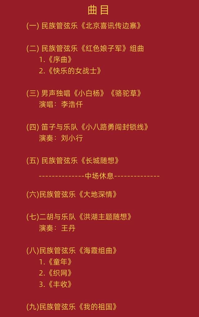 音乐会共有9个曲目,包括民族管弦乐《北京喜讯传边塞》、民族管弦乐《红色娘子军》组曲(《序曲》、《快乐的女战士》)、男声独唱《小白杨》《骆驼草》、笛子与乐队《小八路勇闯封锁线》等。