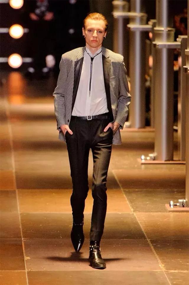 在品牌的2014年春夏系列上,就可以见到 Bolo Tie 的身影,搭配廓形西装外套、修身裤款、尖头皮靴,让人感受到了那一股桀骜之中又带点嬉皮的雅痞绅士格调。
