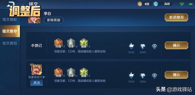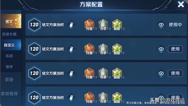 另外很多玩家为了方便都会一键套用职业选手或国服大神的铭文方案,可每次寻找时都需要翻页选择,为了简化操作,未来推荐方案都会整合进一个界面中,如下图所示: