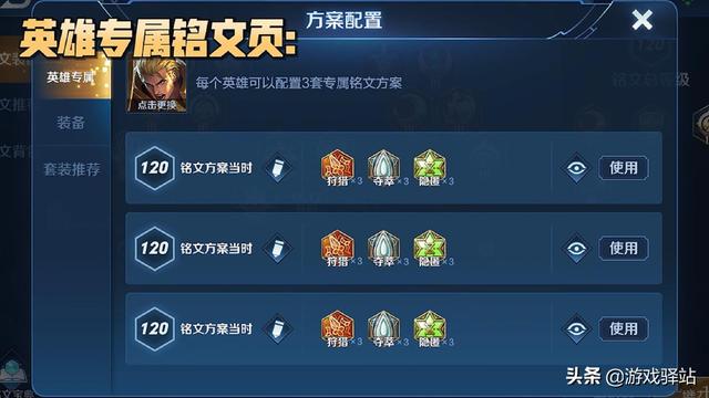 为了解决铭文页不够用的问题,官方新增了英雄专属铭文页方案,类似系统推荐装备,每位英雄都对应三套铭文方案,并且可依据自身需求修改方案,这就避免了使用系统推荐铭文组合时,不知道将其用在哪套铭文页上的繁琐过程!