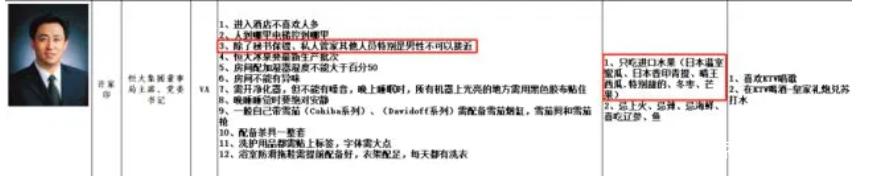 据传,文档中恒大系各公司高管们的个人喜好,包括睡觉的习惯、饮食忌口、康乐活动的要求,都被详细记录下来。