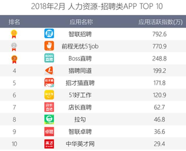 从表格中我们可以看出,2018年2月,传统综合招聘平台代表-智联招聘、前程无忧51job的APP应用活跃指数以较大领先优势居于招聘类APP前两位。
