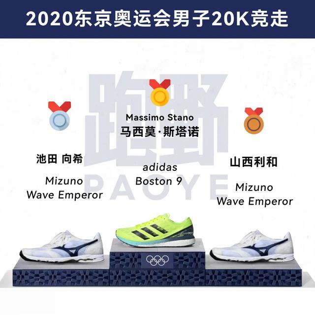 自东京奥运会后,50 公里竞走比赛将退出奥运会,所以在竞走项目中我们只统计了短距离的男女子 20 公里。这一项目的跑鞋排行比较多样化,依靠女子金牌和男子二三名共获得三枚奖牌,没想到美津浓竟成该项目最大赢家!adidas Boston 9 则助力运动员获得两枚奖牌。