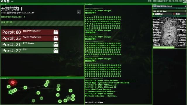 攻击(Exploit)在游戏中,想要破解22端口,21端口,只要相应执行SSHcrack 22和FTPBounce 21即可。这其实是我们通过分析,发现22和21端口刚好是开启状态,所以可以破解。端口就像现实生活中的门一样,主人有钥匙可以随便进出房子,贼没有钥匙就进不去,但是要是真的想偷东西还是得在门上做文章,总不能去砸墙吧,多麻烦。