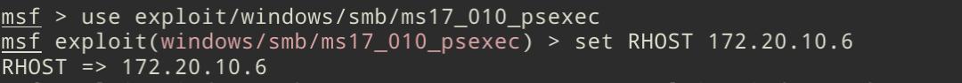 然后输入set RHOST 172.20.10.6 来选择目标主机