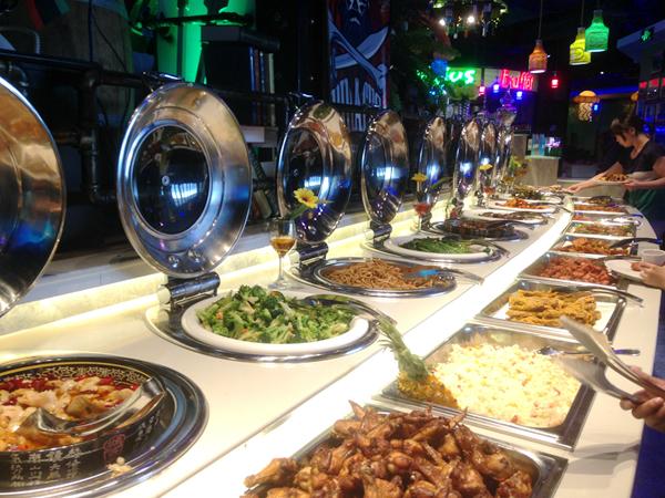 进门迎面看到的是一艘巨轮的造型,舰首摆满了五颜六色的鸡尾酒,甚是吸引眼球,会被小孩子吵闹着要喝哦,幸好我们没带小孩;舰的两侧是水果、凉菜和各种热菜、海鲜、小点心等主食。主色调是海洋蓝配着五颜六色的灯光,置身其中如同在蓝色的海洋中梦幻般地徜徉,惬意而自在。