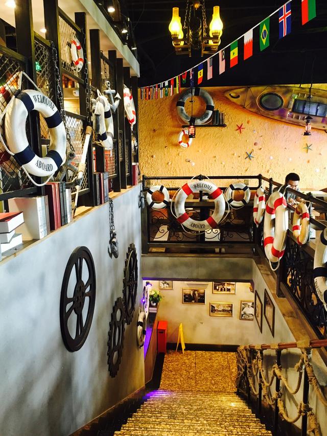 走进店内,海洋元素映入眼帘,船帆、救生圈、渔网和一台液晶电视,电视里正一步步介绍披萨的制作过程及所用食材的营养价值等,我怀着好奇心快步走上二楼,被眼前的一切惊呆了,环境超好,时尚又新潮,快来看看吧帆船倒挂着,无数的救生圈和各国的彩旗交相呼应,颜色搭配和谐亮丽。