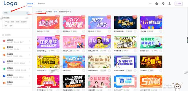 2.在活动市场页面选择自己想要的秒杀活动模板,可以在左侧的搜索框内搜索“秒杀”即可查找并挑选合适的秒杀活动模板。