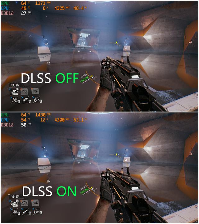 关闭DLSS:27帧 开启DLSS:50帧,帧率提升为46%。