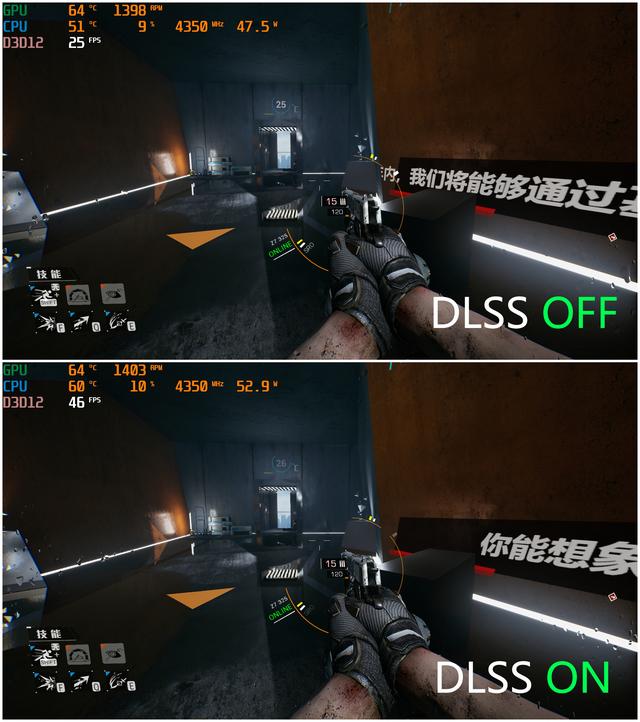 关闭DLSS:25帧 开启DLSS:46帧,帧率提升为45%。