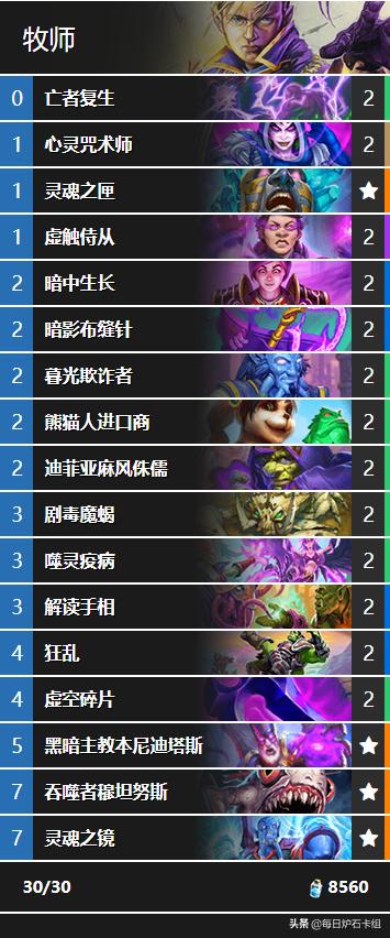 本期推荐卡组来自外服玩家Habugabu,TA用这套全新的控制暗牧成功登顶标准天梯。相关卡组牌表如下,惯例神秘代码见文末~