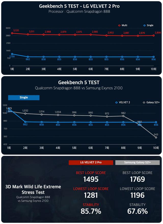 LG Velvet 2 Pro的骁龙888调教比较激进,3D Mark稳定性虽然看着只有85.7%,但3D Mark烤机最高温竟然高达58.9度?而旁边的Exynos 2100版S21+最高温“只有”48.5度。未能确定真机是否真的这么猛?还是因为up主的红外温枪读数偏高?