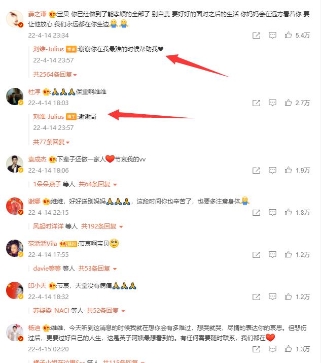 谢娜、杨迪在内的十多位圈内好友纷纷到评论区安慰刘维,希望他可以节哀。杨迪还表示:“有任何需要随时联系”。