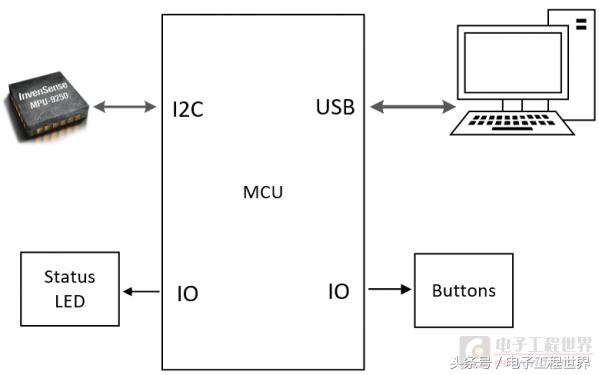 通过I2C接口采集传感器数据;强大的运算性能和浮点DSP的支持保证了数据融合、姿态解算等算法的高效、准确运行;控制LED作为状态指示;扫描按键状态;通过USB接口与PC机通信。