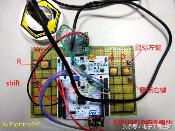 Demo板说明:Demo板配置了9个按键,Nucleo板载蓝色按键为模式切换按键,开机板载LD2绿色LED快闪表明此时为锁定状态,控制器不起作用,短按1下,切换到按键控制模式,LD2慢闪,再短按切换到体感控制模式,LD2 1s闪烁一次,再按切换到锁定状态;板载4个大按键,依次映射为WASD,4个小按键依次映射为R、shift、鼠标左键、鼠标右键。