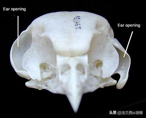 上图是最常见的猫头鹰--鬼鸮(Aegolius funereus)的头骨。外貌端正的猫头鹰,藏在羽毛下的头骨却有明显不对称的结构,两只耳朵,一高一低,开口形状各有不同。右耳开口朝上,左耳开口朝下。当猫头鹰从高处俯冲向地面猎物时,从正前方传来的声音,在右耳里会比左耳里更响。当猫头鹰呆在树上时,从正下方传来的声音,在左耳里会比右耳里更响。