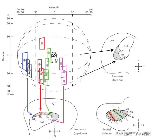 声音绘制的空间地图储存在猫头鹰大脑里,位于中脑的一个叫下丘外核的地方,不同的声音位置对应不同的神经元,来自正前方的声音激活下丘外核前边缘的神经元,侧面的声音激活相对靠后的神经元。