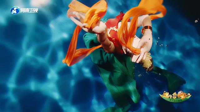 波光粼粼的水下衣褶如云雾散开,曼妙的舞姿令人如痴如醉,极诗意地描绘出洛水仙子遨游水中的梦幻场景。