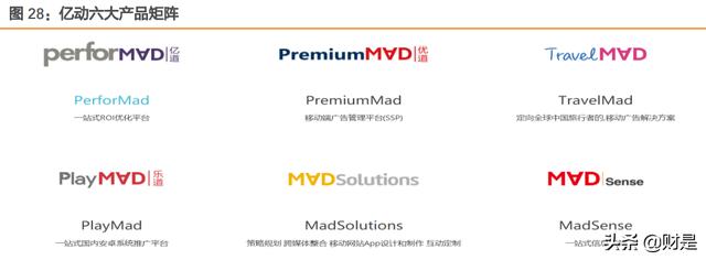 亿动具有成熟的产品体系,产品覆盖六个模块,并与谷歌、Meta、Twitter、美图秀秀、滴 滴出行、墨迹天气等优质媒体合作,为客户提供一站式解决方案。亿动旗下分为亿道,优 道,乐道,Travel MAD,MadSolutions 及 Madsense 六大板块,分别负责不同细分领域的 投放业务。