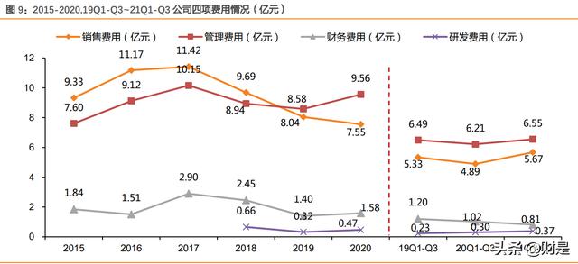 费用端近年持续改善,经营效率不断提高。蓝标在 18 年起不断改善内部经营,良好控制 费用,21Q1-Q3 公司的销售费用率和管理费用率分别为 1.8%和 2.1%,相比前期有明显改善, 显现规模效应及公司营销智能化产品的应用成果。公司推进偿还有息负债,19 年起财务费 用下降明显,21Q1-Q3 公司的财务费用为 0.81 亿元,财务费用率下降至 0.1%。