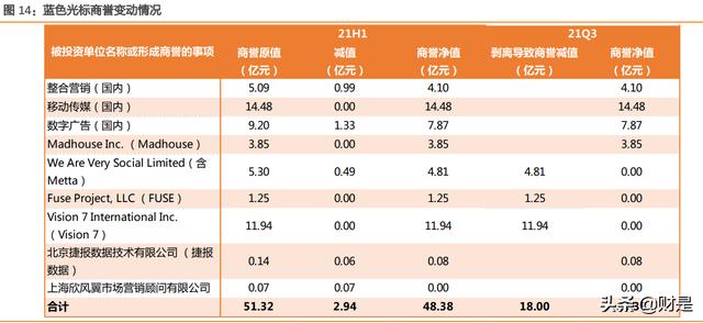 截至 21Q3,蓝标剩余商誉净值 30.38 亿元,其中以多盟亿动为主体的移动传媒资产组商誉 最高为 14.48 亿元,该部分业务从收购起至今增速明显,商誉减值风险较低。
