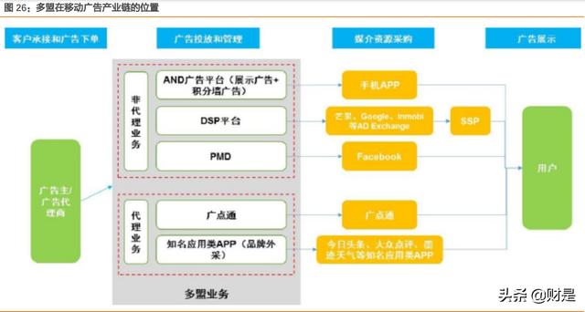 国内全案广告代理:基于强大的技术、大数据及服务能力,为客户提供全方位数字广告投 放及有效提升客户的获客能力。具体技术驱动的短视频创作与投放、程序化媒体购买、服 务驱动的头部媒体购买,互联网电视广告营销代理,以及面向大客户的移动营销全案等。 旗下包括多盟、亿动、博杰、精准等子品牌。