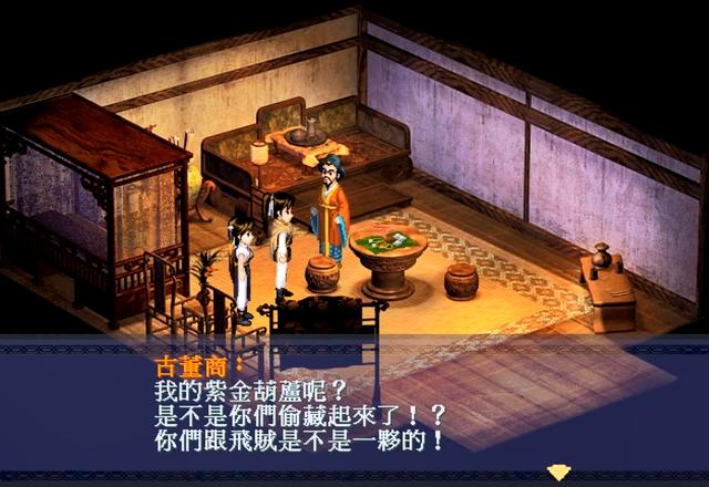 再次打败女飞贼后,拿回被盗的包袱,回到客栈还给古董商,结果里面的紫金葫芦不见了,这古董商瞬间翻脸,认为李逍遥他们两个和女飞贼是一伙的,于是直接跑去报官。这古董商就是那种典型的倒打一耙,有时做好事还真要付出一些代价。就是不知道这紫金葫芦是不是西游记中银角大王手上那个,“叫你一声你敢答应吗?”