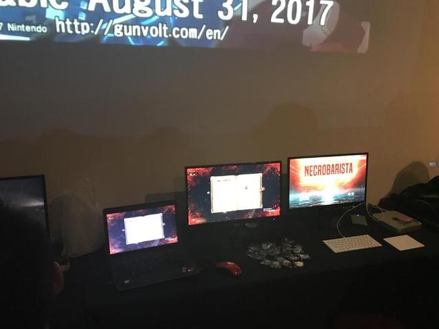 在另一家酒吧等待派对“对外”开放期间,我们交流了《黑暗之城》中的一些段落,并近距离感受了一下委内瑞拉式的生活(敬请期待我之后的另一篇)。加入派对之后,我们很快就被人流冲散了……在观察他们的过程中,我才意识到原来国内的游戏发行商已经有如此强烈的国际意识与存在感了:椰岛与方块游戏在会场中各占一席,《SINNER: Sacrifice for Redemption》、《启蒙》(Enlightenment)等国产游戏皆在现场提供了试玩。IronicLark在VR展位观察了许久,而Kiririn51在体验过《Necrobarista》之后,兴高采烈地对我说:“这游戏的开发者表示受了《VA-11 HALL-A》的影响,你看我们也能激励(Inspire)别人开发游戏了!”