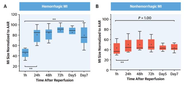 在64例纳入患者中,45例(70%)检测到心肌出血。再灌注伴心肌内出血的STEMI患者的梗死区更严重,研究发现PCI术后五天内,与IMH- 组相比,IMH+ 组患者的心肌梗死面积大小和透壁性显著增加。
