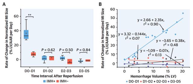 进一步探究IMH+ 组和IMH- 组之间心肌损伤的演变速度,研究者发现,在再灌注前24小时内,IMH+ 组表现出显著更快的梗死浪潮,且前24小时内梗死浪潮的发生率与心肌内出血体积显著相关。此外还发现出血而非缺血严重程度决定了MVO的范围和再灌注后MVO的扩张程度。