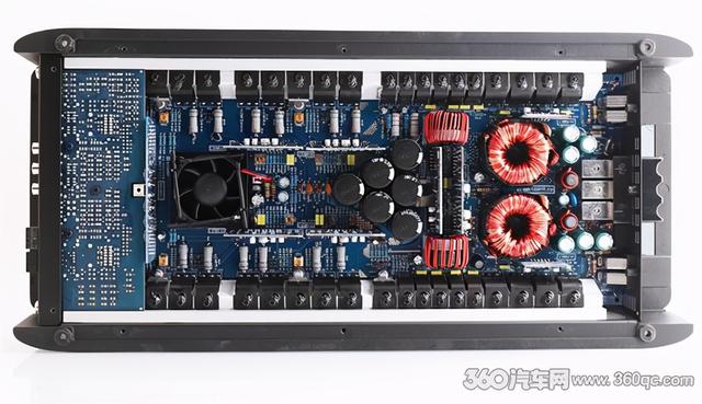 电路的一侧是两只大型的的环形线圈(也被称为火牛),以及围绕线圈的高品质滤波电容、电感等元器件,确保机器从容稳定的完成信号放大的任务,为整个音响系统提供充沛强劲的动力支持。中间区域是呈三角形摆置的6只电容,相当于两大火牛旁的蓄水池,使得功率输出能够源源不断且有更好的稳定性能。电容的另一边是前级信号和信号处理部分,AB类功率放大架构。这样左右分开的电路设计大大降低了信号处理与传输时的干扰和损耗,失真率控制在很低的0.04%以内,信噪比在100dB以上,确保了AV Quattro的音质纯正度。为了让电路转行时所产生的热量更快的驱散,还安装了一台散热风扇来促进空气的流通,能够快速冷却以确保机器能够稳定、高速的运转。