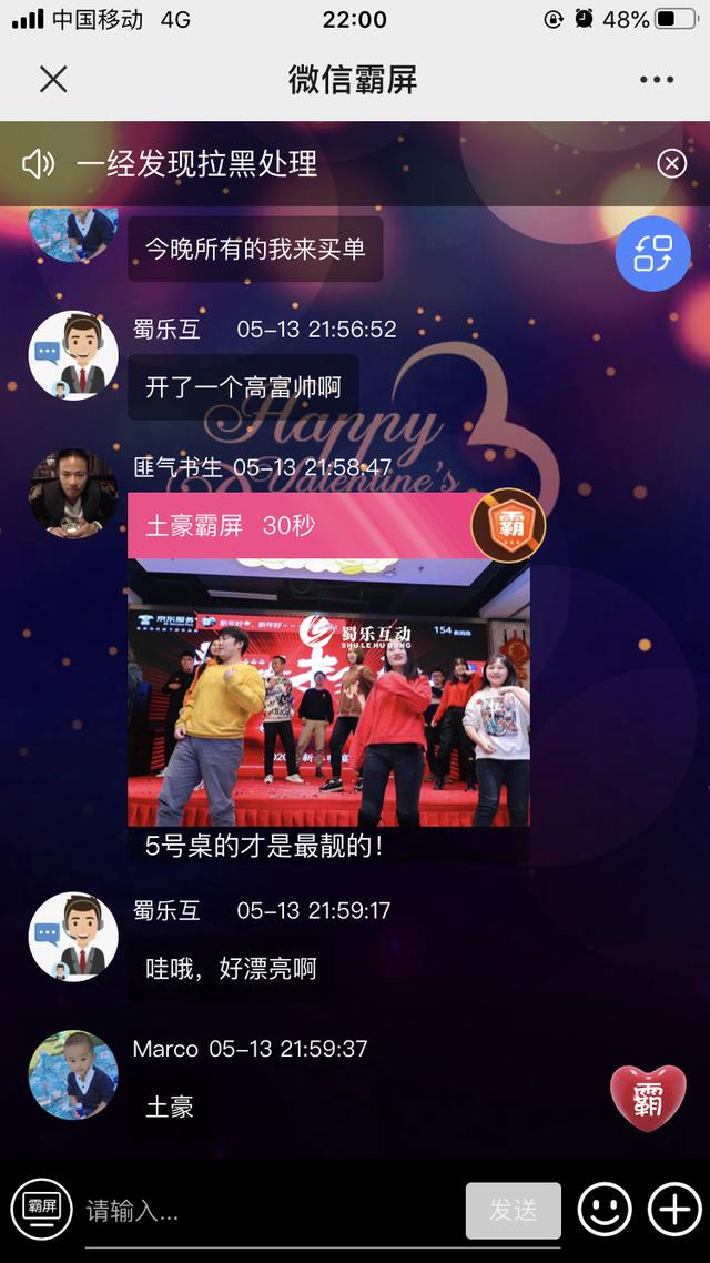 微信上墙大家都比较熟悉,在酒吧和清吧等这样娱乐性较强的场所是一定要有的,但是基础的弹幕墙已经不能满足年轻人的需要了,要用更加炫酷炸场的产品才能吸引新时代的年轻人。在传统的“微信墙”基础上,蜀乐互动推出了“霸屏上墙”新产品,通过发送文字、图片、表情等内容在屏幕上进行展示,用户可以选择付费将发送的内容进行霸屏展示,商家后台可以设置多个等级的付费霸屏以满足不同的需求。