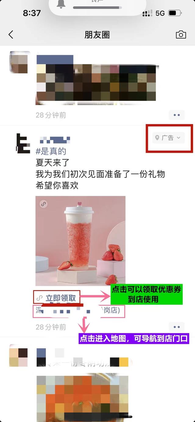 而这个问题,腾讯朋友圈广告就完美解决了,就在疫情发生的几个月后,腾讯为了帮助商家解决引流曝光问题,朋友圈推出了“附近推”产品。顾名思义就是以商家为中心方圆1-20公里内的人群在刷朋友圈的时候都能看到商家的广告,(系统通过用户支付痕迹分析出意向客户进行推送),让每一次曝光都产生它的价值,就是下面这种广告,朋友圈第5条,我相信每个人每天都能看到吧,这个产品的推出彻底解决了,传播慢,不精准,被屏蔽,曝光范围小等问题。