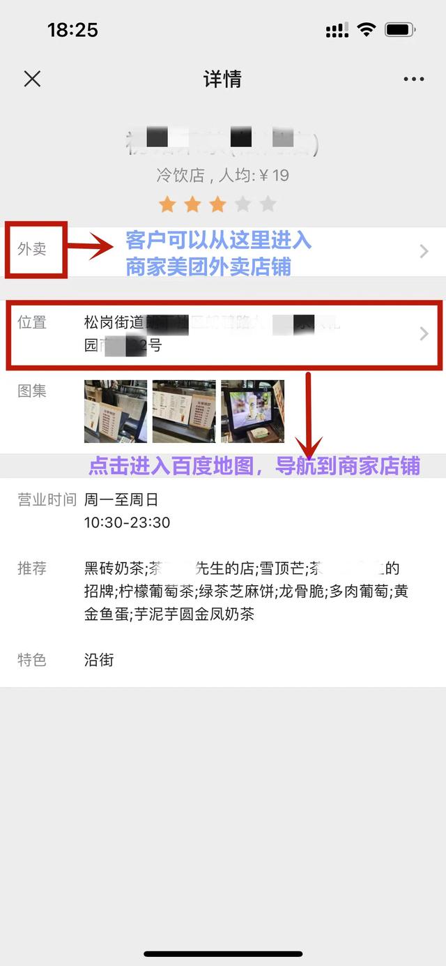 从图中我们可以看到,当用户看到这条广告的时候,可以点击地址通过导航找到商家的店铺,也可以通过这条广告进入商家美团外卖进行下单,一条广告可以帮助商家解决多个问题。