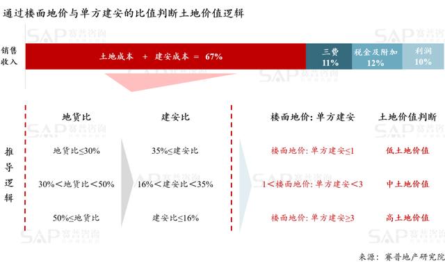 我们基于收入构成分析,结合地货比的取值,推导出通过楼面地价与单方建安成本的比值,来判断土地价值的指标值,如下图所示: