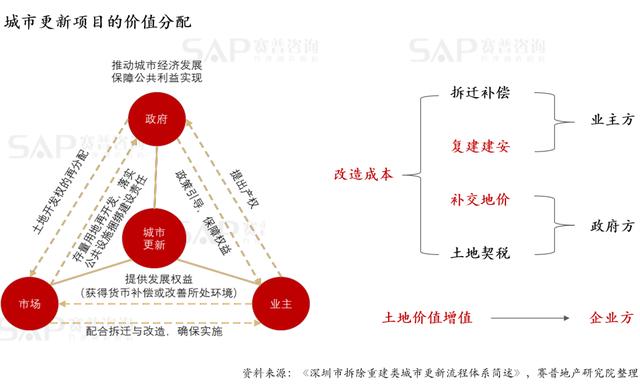 从经济视角来看,城市更新项目本质上是更新后该区域的土地价值增值在政府、房企与业主之间进行的重新分配: