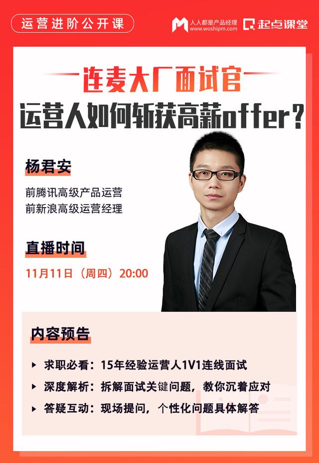 为此我们特别邀请了从事互联网运营15年+互联网运营经验,前新浪高级运营经理@杨君安老师 担任面试官,在11月11日20:00点进行在线连麦模拟面试。