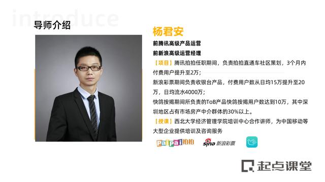 本次公开课由从事互联网运营15年+互联网运营经验,前新浪高级运营经理@杨君安老师 授课,老师先后在多家BAT大厂供职,有丰富的运营实战经验。